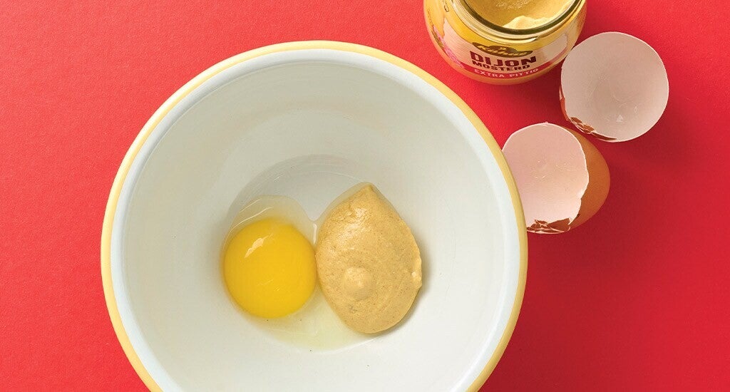 Voeg de mosterd en azijn bij de eigelen. Roer met een garde tot alles mooi is vermengd.