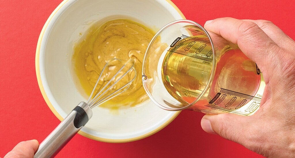 Voeg straalsgewijs de olie toe terwijl je blijft kloppen met de garde.