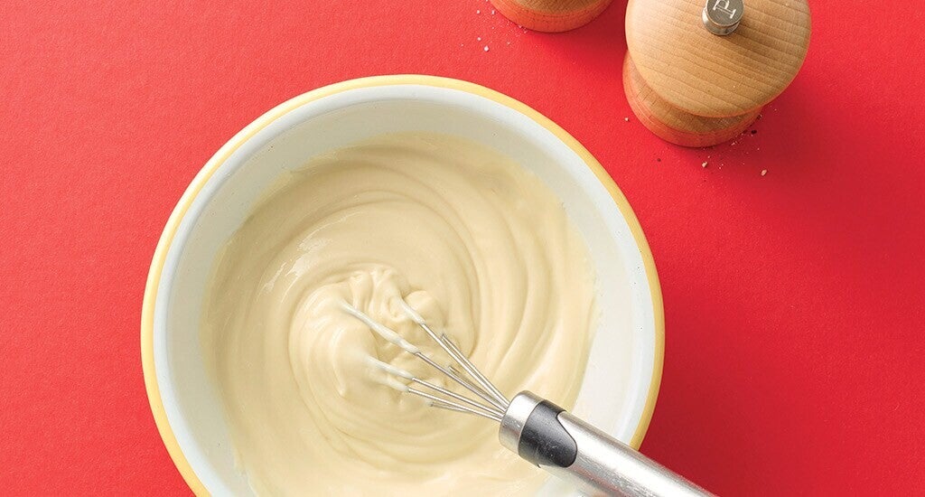 Mosterd → helpt de emulsie en geeft wat smaak/pit.